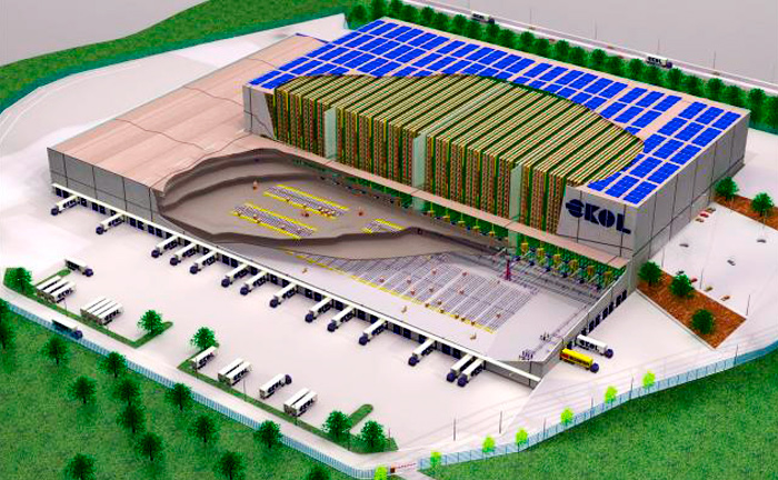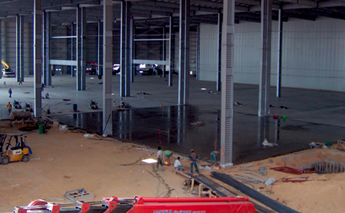 Steelfibre concrete floor with hardener slurry in light grey, dark grey and yellow, storage racks until 15 meters, Istanbul, Turkey.